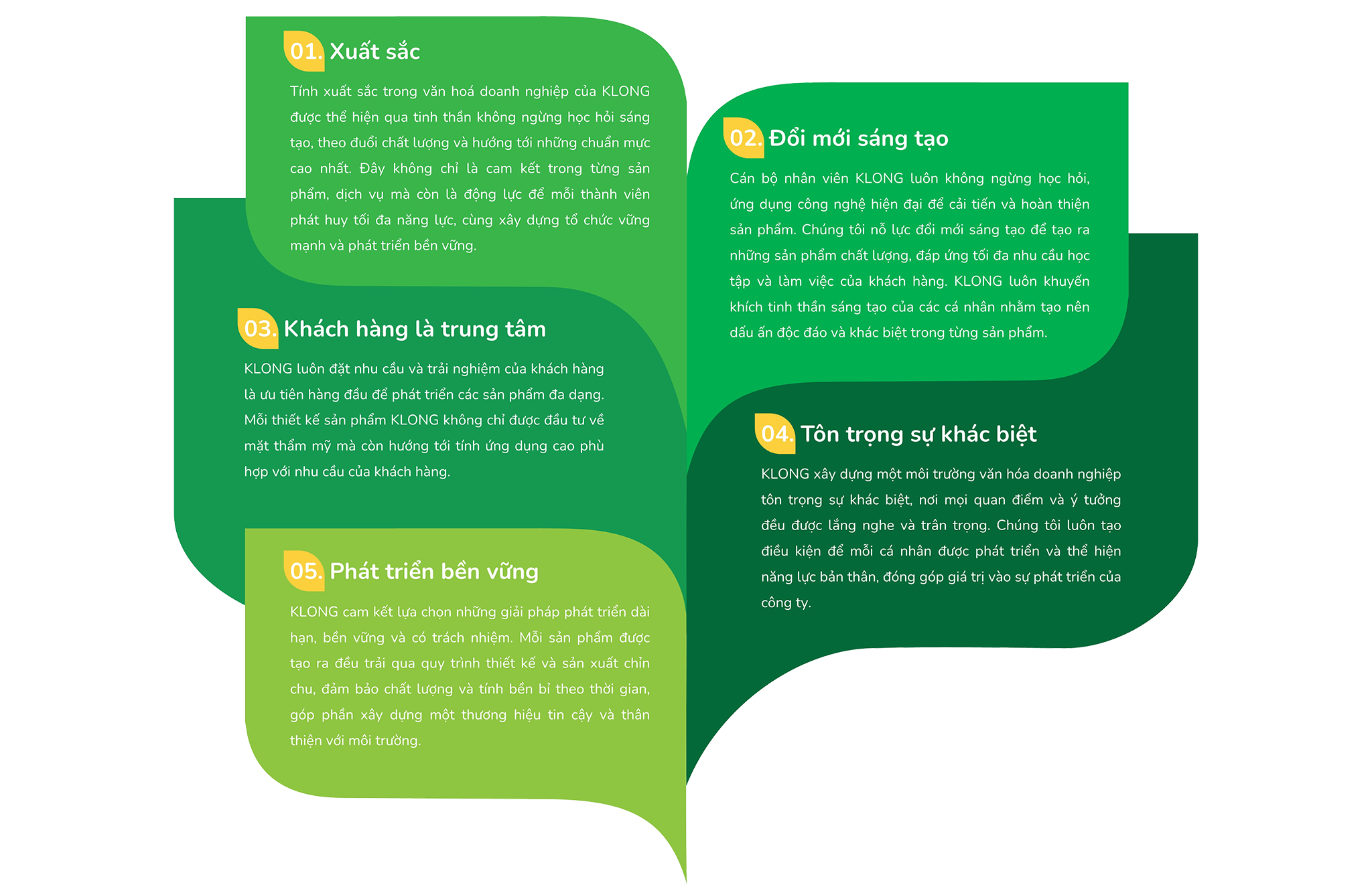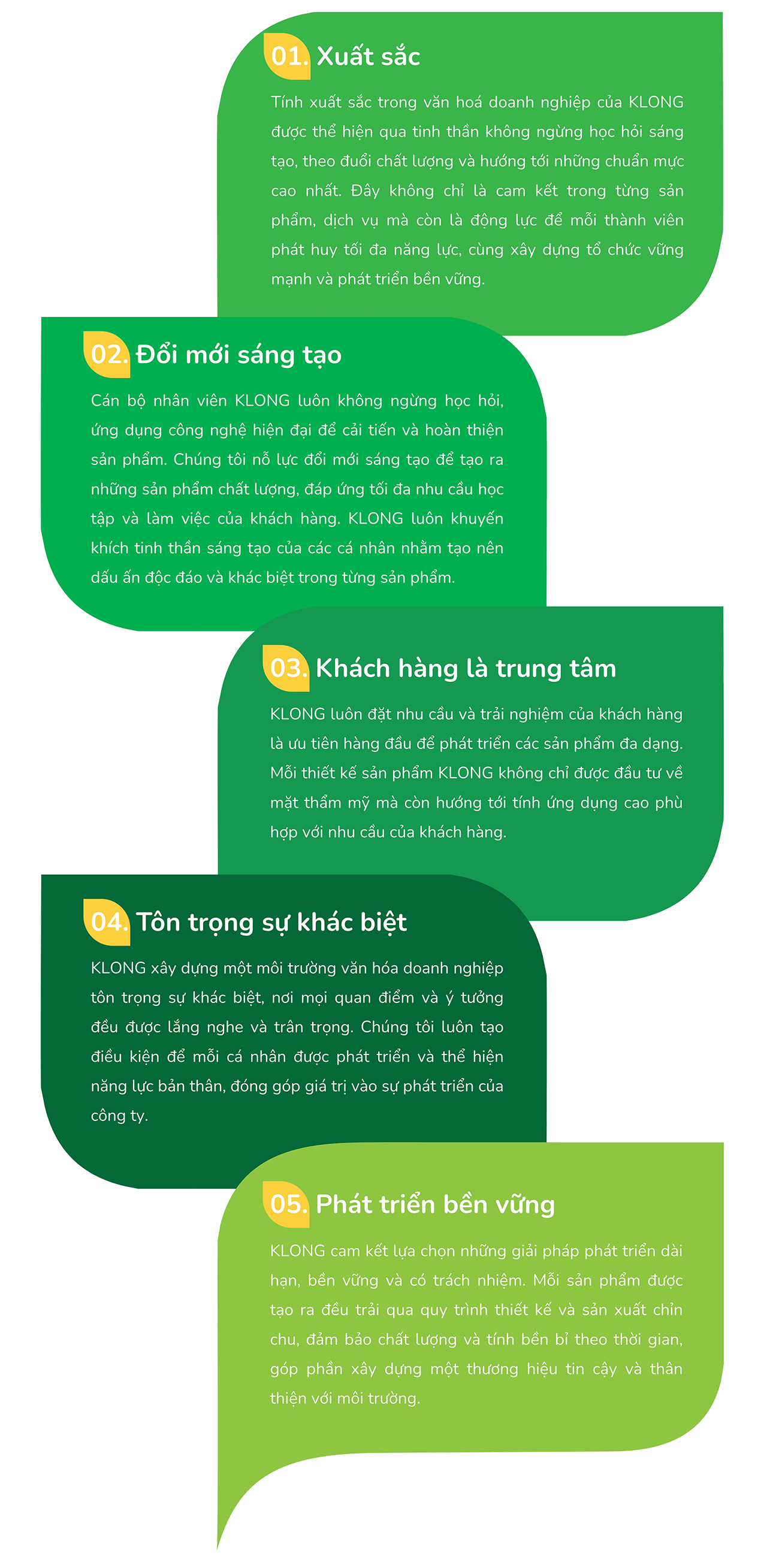 KLONG cung cấp sản phẩm với tính thẩm mỹ và tiện ích cao, giúp tạo cảm hứng và nâng cao trải nghiệm ghi chép hiệu quả trong học tập cũng như trong công việc, qua đó trở thành người bạn đồng hành cùng người dùng trên hành trình hiện thực hóa mục tiêu của mình.